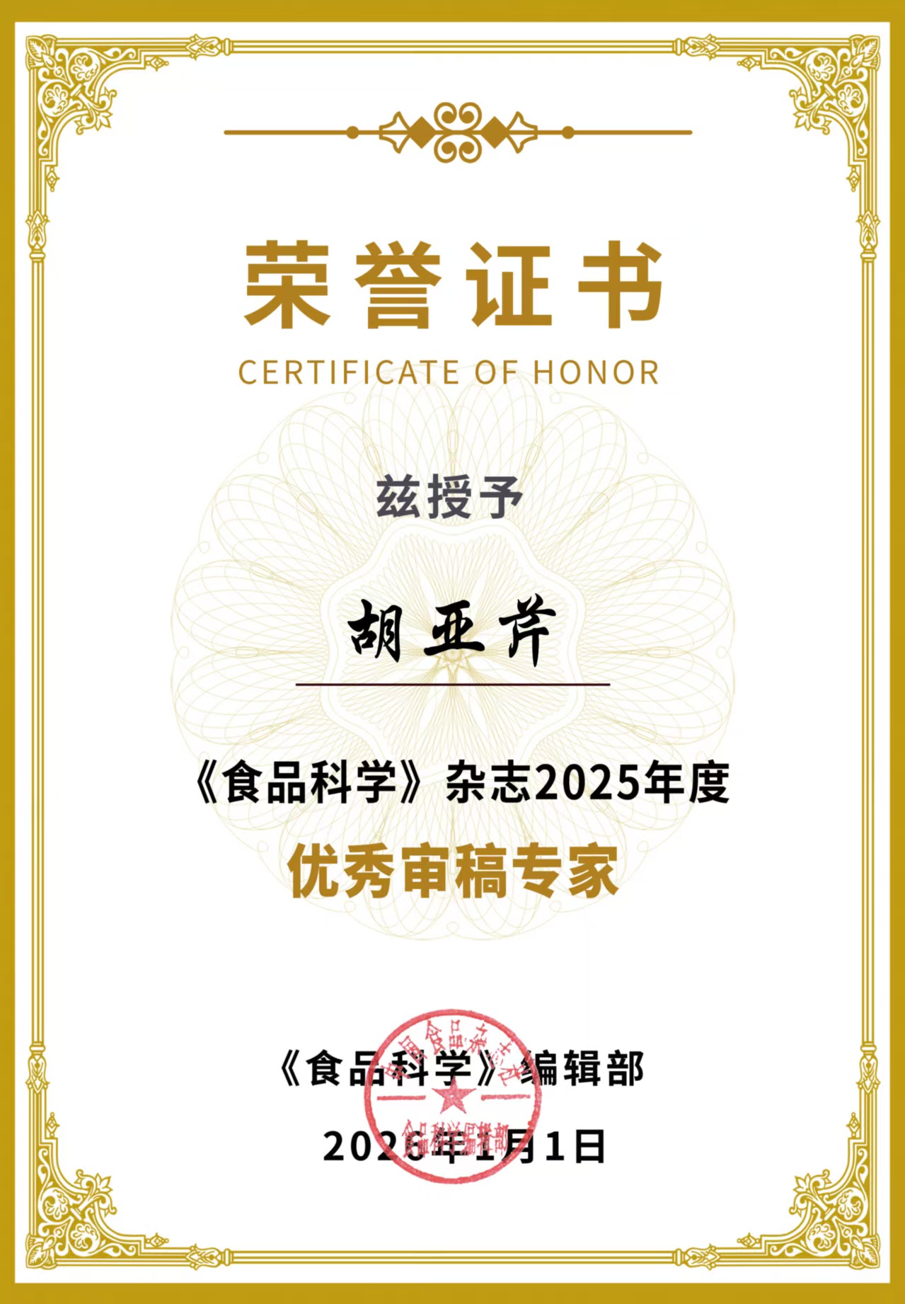 海南热带海洋学院食品科学与工程学院胡亚芹教授荣获《食品科学》杂志2025年度“优秀审稿专家”称号