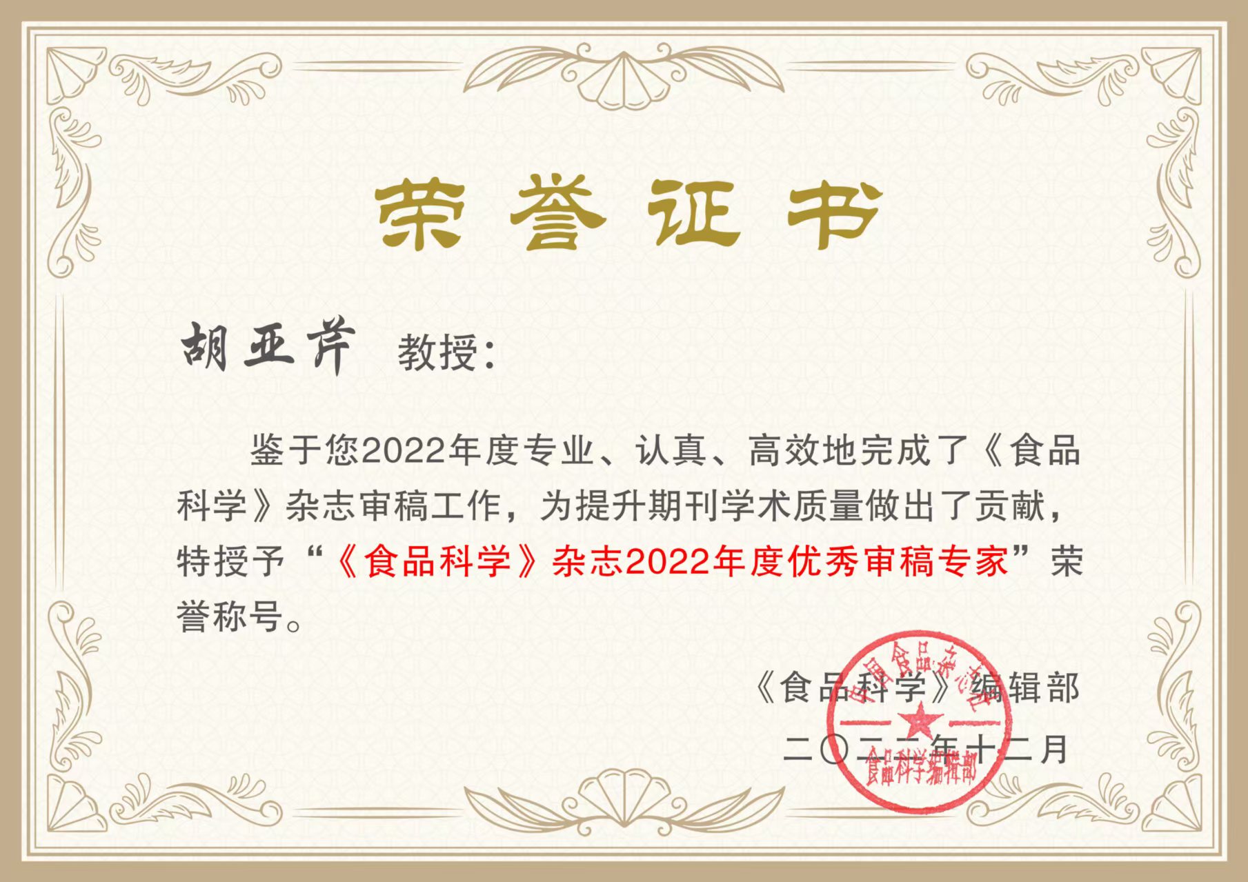 《食品科学》杂志是我国食品科技领域具有重要影响力的核心期刊之一,其“优秀审稿专家”评选严格,旨在表彰在学术评审工作中作出突出贡献的学者。胡亚芹教授的当选,彰显了食品学院教师在服务国家学术共同体、引领学科发展方向方面的积极作为。