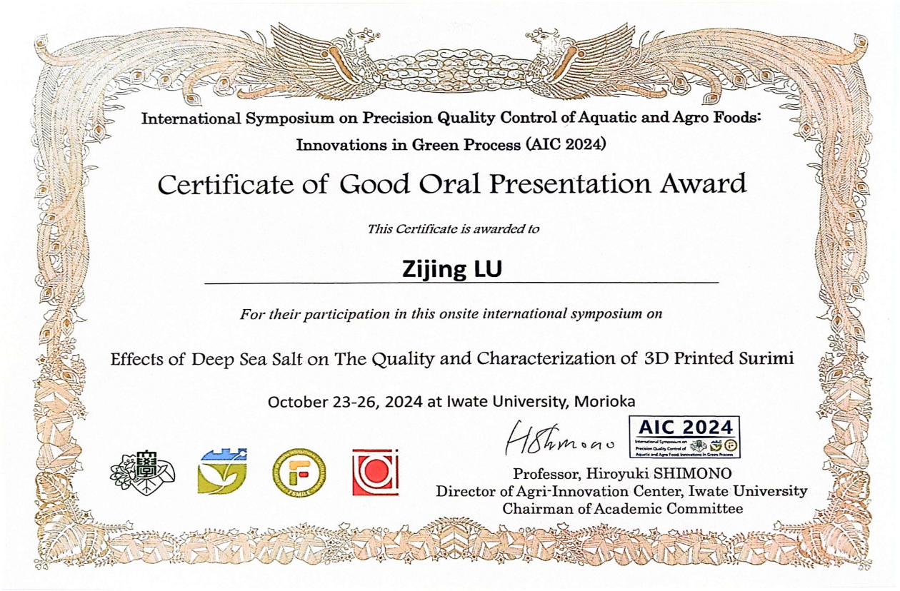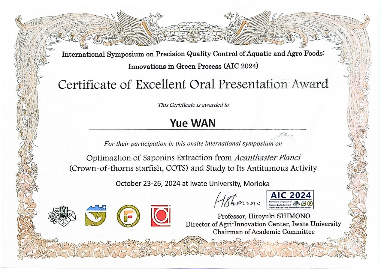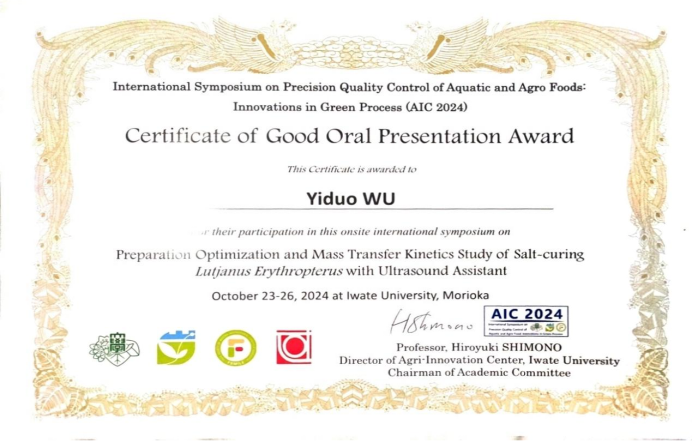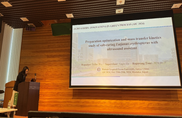 10月23日至26日,我院胡亚芹教授带领生物与医药硕士研究生吴亦朵、万越、卢紫腈三人赴日参加“International Symposium on Precision Quality Control of Aquatic and Agro Foods: Innovations in Green Process (AIC2024)”,此次会议由农业创新中心(AIC)主办、日本岩手大学承办,共有中、日、韩、美、欧等10个国家,120余名研究者参会,主要介绍和讨论了食品系统质量控制和可持续性发展的最新科学进步和技术成果。
