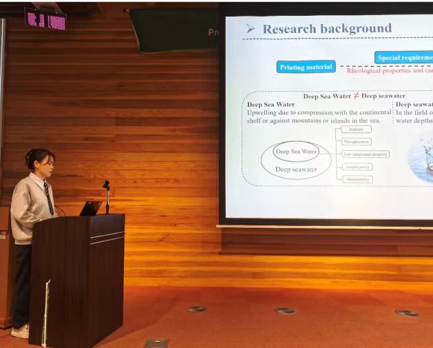 卢紫腈以“Effect of deep-sea water on the quality and performance of 3D printed surimi”为题做口头汇报,主要以深海盐、大米淀粉和叶黄素为物料,制备并优化了一种3D打印鱼糜制品,并从微观结构、化学键、消化和抗氧化活性进一步验证深海盐对3D打印鱼糜制品质量和性能的影响。